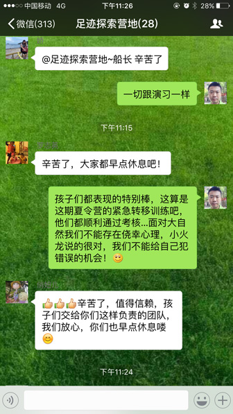| 第一天,孩子們?nèi)霠I。教練跟營員們約定好營地紀(jì)律承諾做到獨(dú)立勇敢堅(jiān)持!僅僅一天就融入了營地,宿舍物品擺放井井有條,在相互檢查環(huán)節(jié)全部過關(guān)了,晚上還自編自導(dǎo)了精彩的晚會(huì),孩子們現(xiàn)在獨(dú)自洗澡洗衣服入睡,他們認(rèn)同參加足跡探索營地,并且和隊(duì)友一起完成所有挑戰(zhàn),足跡探索營地所有工作人員期待孩子們的成長,加油吧… |